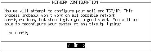 If you are not going to be connected to a network, choose loopback. If you are setting up a computer that will be attached to a university or large office network, you should most likely choose DHCP. Otherwise, choose static IP. Unless you chose static IP, you are now done. If you did choose static IP, you will now have to enter your computer's IP address, network mask, broadcast address, and name server address. netconfig will tell you how to figure out all of those numbers.