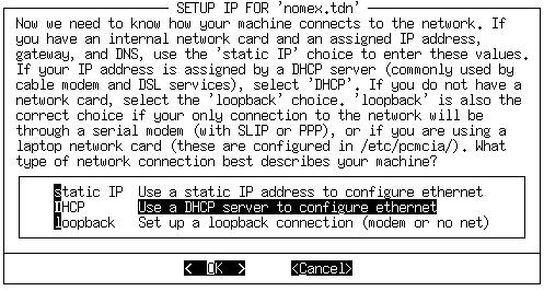 Next, you'll be prompted to enter the hostname and domain name of your computer. You can probably just make something up for both of these, unless you are setting up a server or other machine that lots of people will use. Then, you will be asked if you will be using a static IP, DHCP, or just loopback.