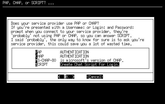 If you have to use callback, select “YES”. Then, you'll be prompted to enter your phone number, a login name, and a password. You may not have to enter an initial login name and password. Finally, you'll be asked what kind of authentication scheme your ISP uses. If they use CHAP or PAP, select “YES”. Later on, you'll need to set this up. Refer to the section below. If they don't use either of those, select “NO” and refer to the “Chat script” section below.