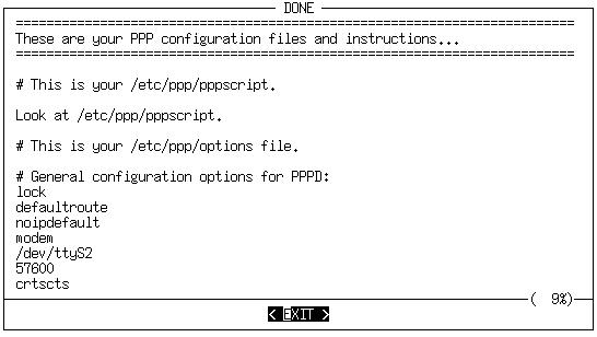 Finally, you'll be shown your complete ppp configuration files. You can't really do anything about them, but you can at least check everything out. Hit enter to save everything and leave pppsetup.