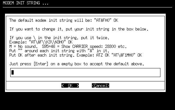 Unless you have a strange modem, you can probably just hit enter to select the default init string (“AT&FH0”). Otherwise, refer to any documentation that came with your modem as to what to use for the init string.