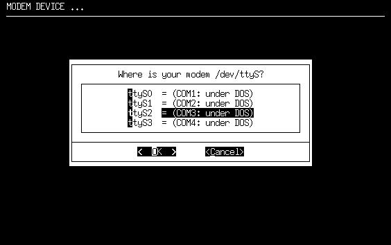 Next, select the location of your modem. If you know what COM device it was under Windows, you can select the listed equivalent. Otherwise, you might have to do some experimenting. The best course is to start at ttyS0 and work your way down the list.
