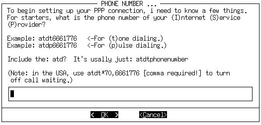 The first question prompts for the phone number of your ISP, prefixed by the type of dialing. For most people, you will want to use tone dialing. If your ISP's phone number was 555-1013 and you used tone dialing, you would enter atdt5551013 into the dialog box.