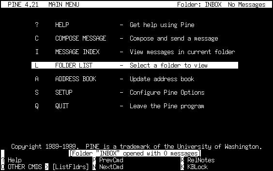You will see a menu of commands and a row of command keys at the bottom. pine is indeed a complex program, so we will not discuss every feature about it here.