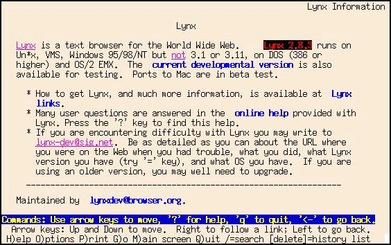 lynx prints the command keys and what they do at the bottom of the screen. The up and down arrow keys move around the document, Enter selects the highlighted link, and the left arrow goes back to the previous page. Typing d will download the currently selected file. The g command brings up the Go prompt, where you can give lynx a URL to open.